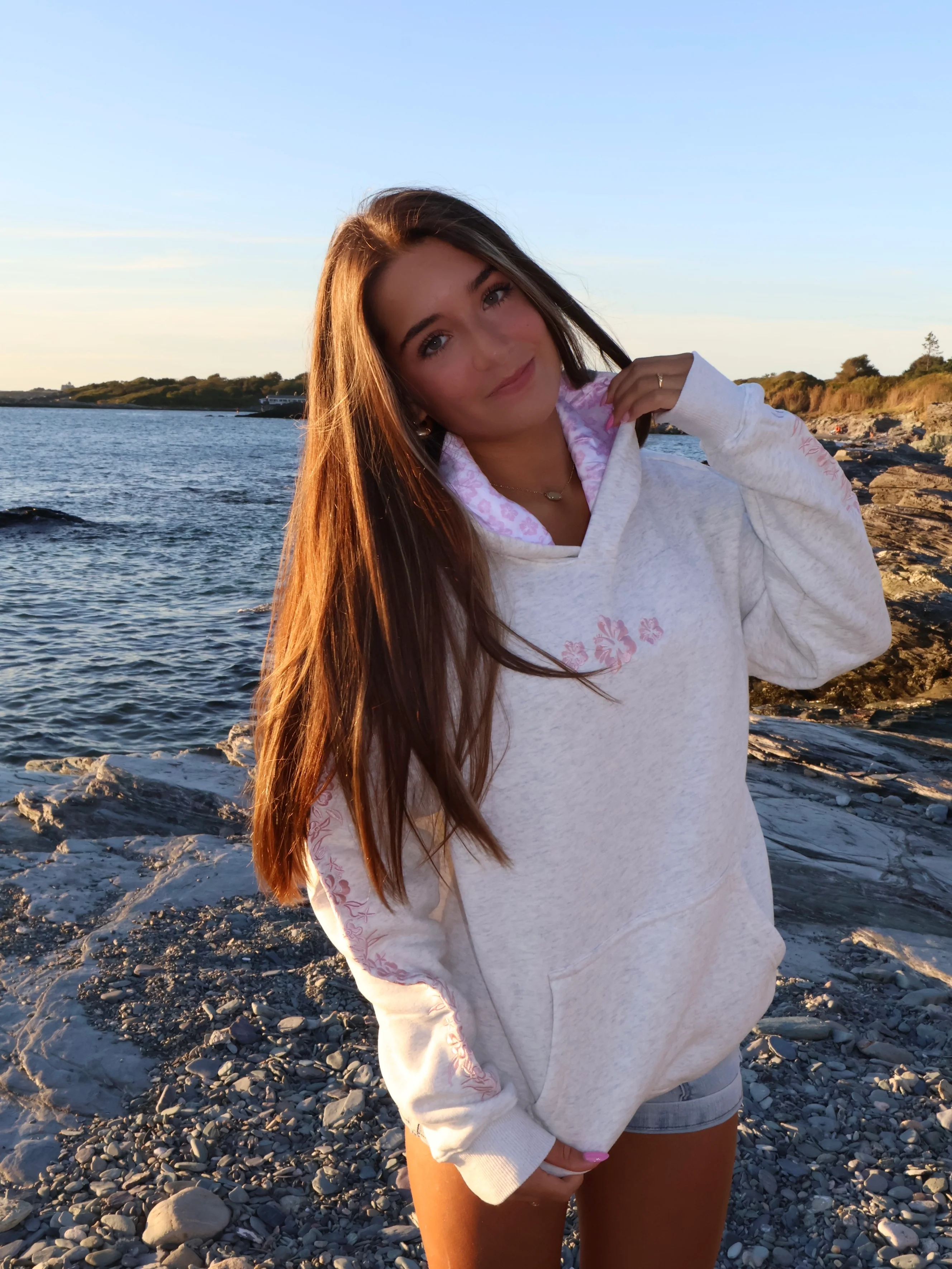 Soft heather gray hoodie with three blush pink hibiscus flowers embroidered on the chest. Floral vines embroidered down each sleeve. Satin hood lining detailed with pink hibiscus flowers. Our satin lining adds a touch of elegance while protecting your hair from frizz. Drop shoulder, relaxed, and cozy fit. The comfiest and softest hoodie you'll own!