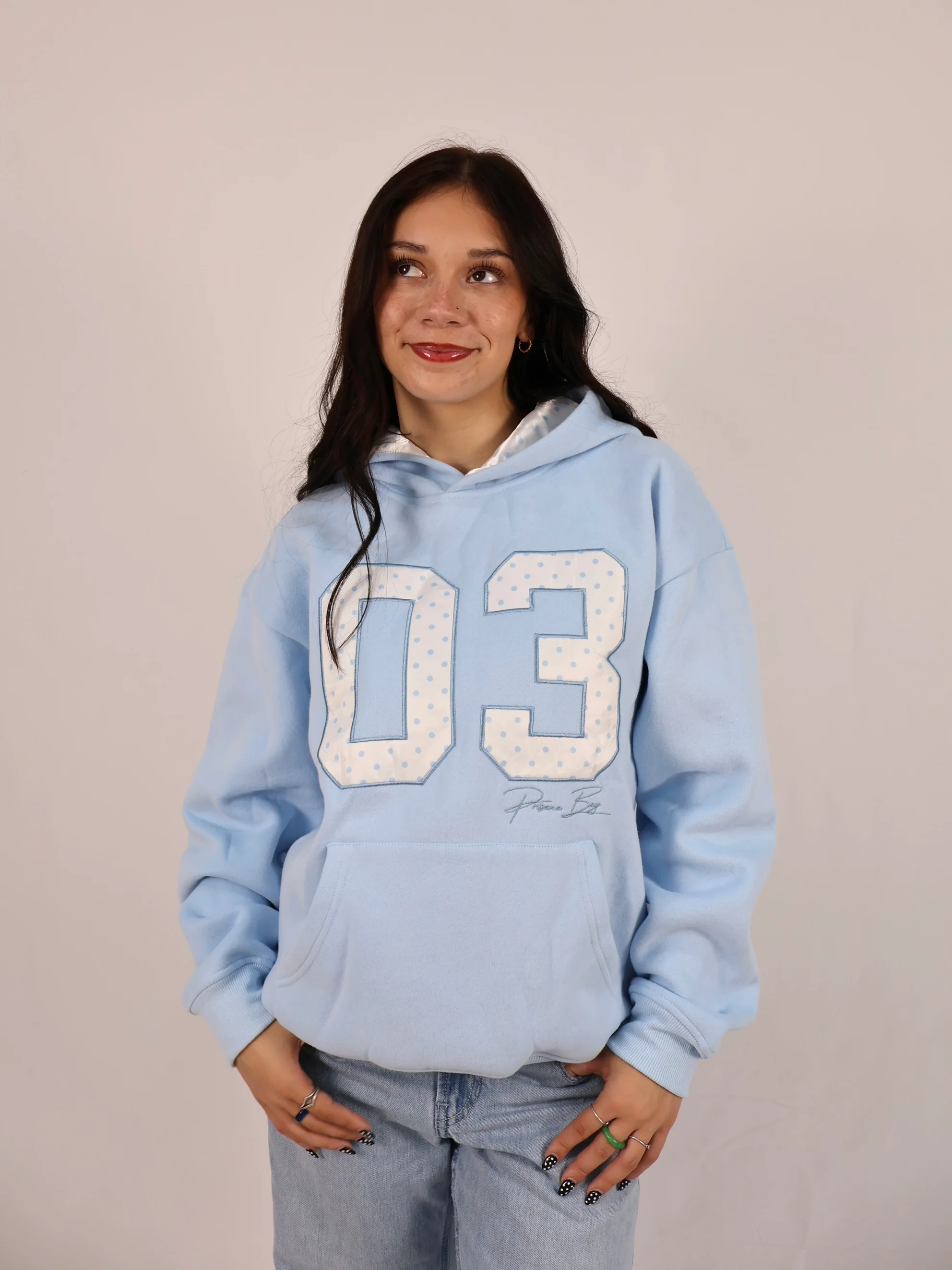 Soft pastel blue hoodie featuring a patchwork “03” on the chest. The hood is lined with our signature satin, detailed in blue polka dots. Drop shoulder, relaxed, and cozy fit made for everyday comfort. Game day just got way cuter!